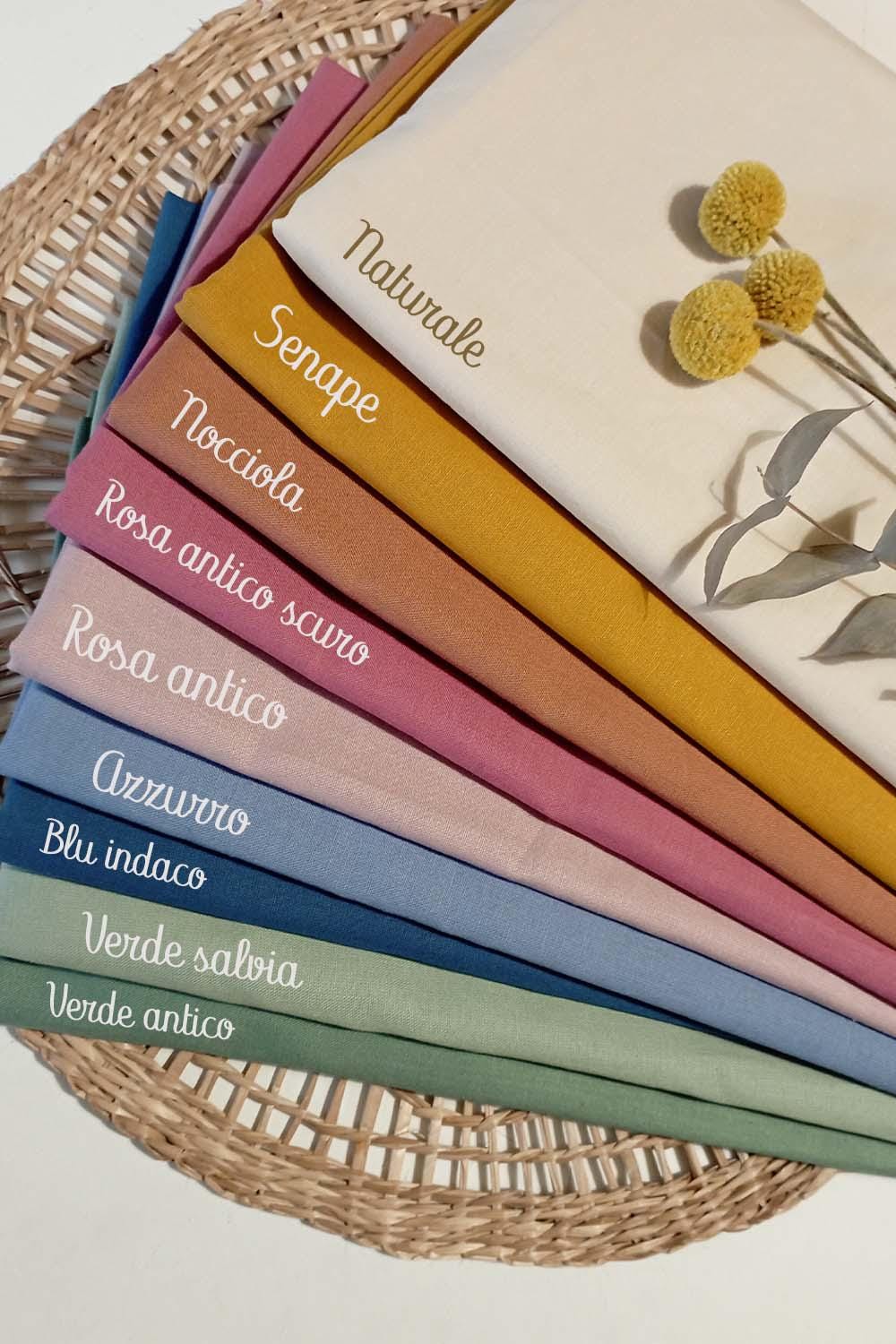 There are 9 colors to choose from. The name embroidery is done in matching colors as shown in the photo (white on colored ones and bronze on natural ones), but you can choose a different thread color; just message me.