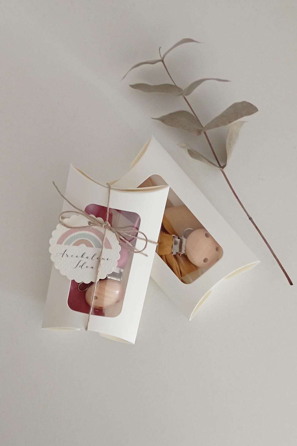 **The pacifier holder is sold in a cardboard box, also ideal as a baby shower gift.**