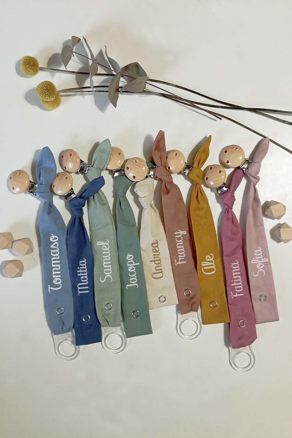 Ho preso un portaciuccio giallo con attacco universale MAM e il nome di mia figlia ricamato. Mi piace molto, esattamente come lo cercavo e sta resistendo bene nel tempo nonostante l'uso continuo da parte di una bimba piccola ;)