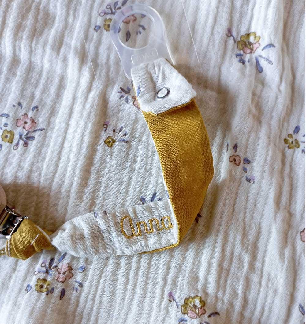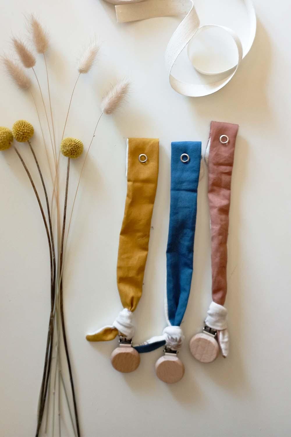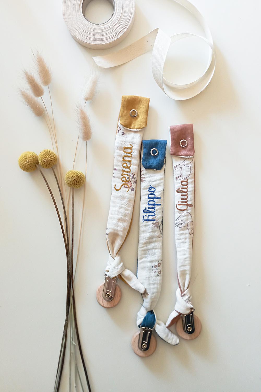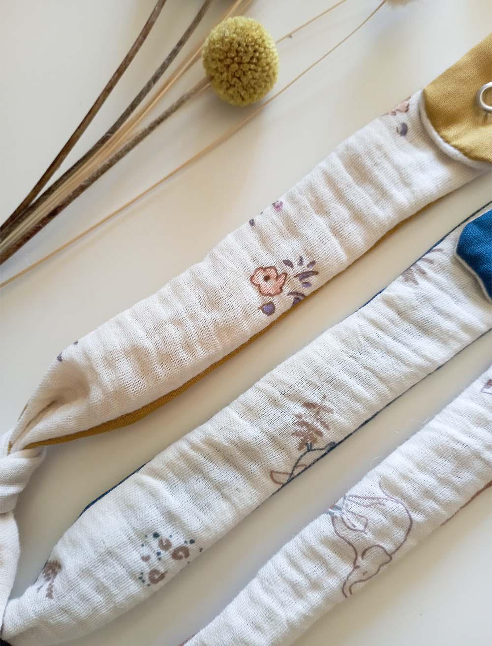 Handmade pacifier chain made of patterned cotton muslin and matching plain cotton, knotted and handmade.