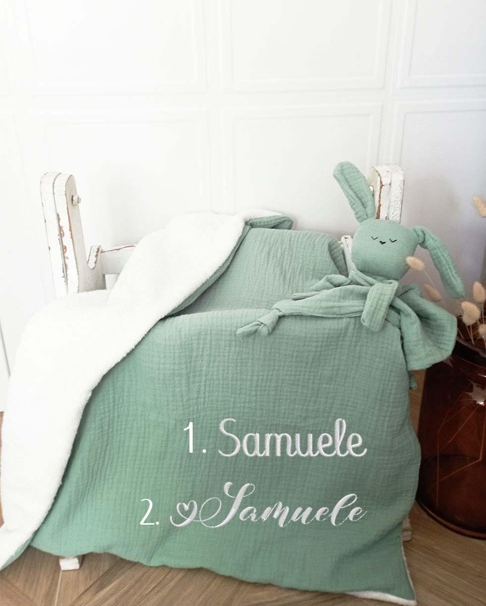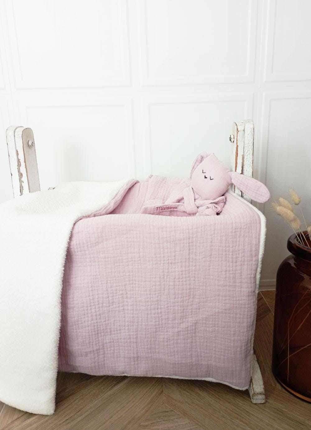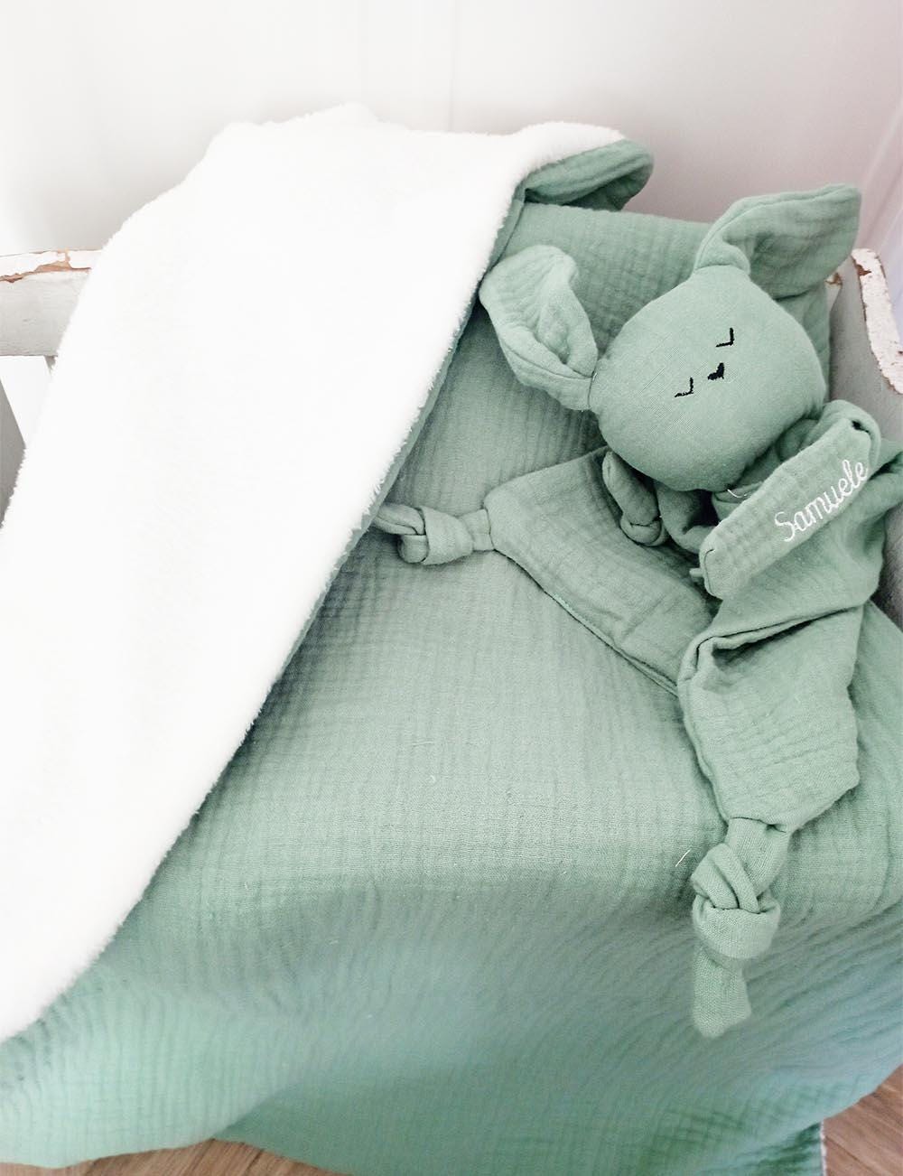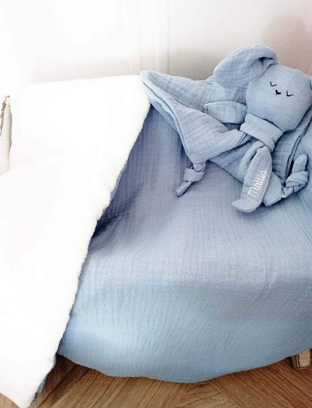 Muslin blanket for newborns that can be combined with the doudou and personalized with an embroidered name.
