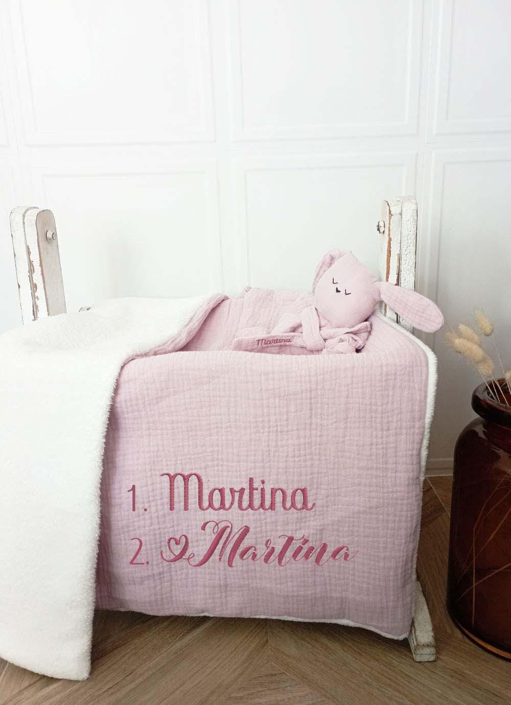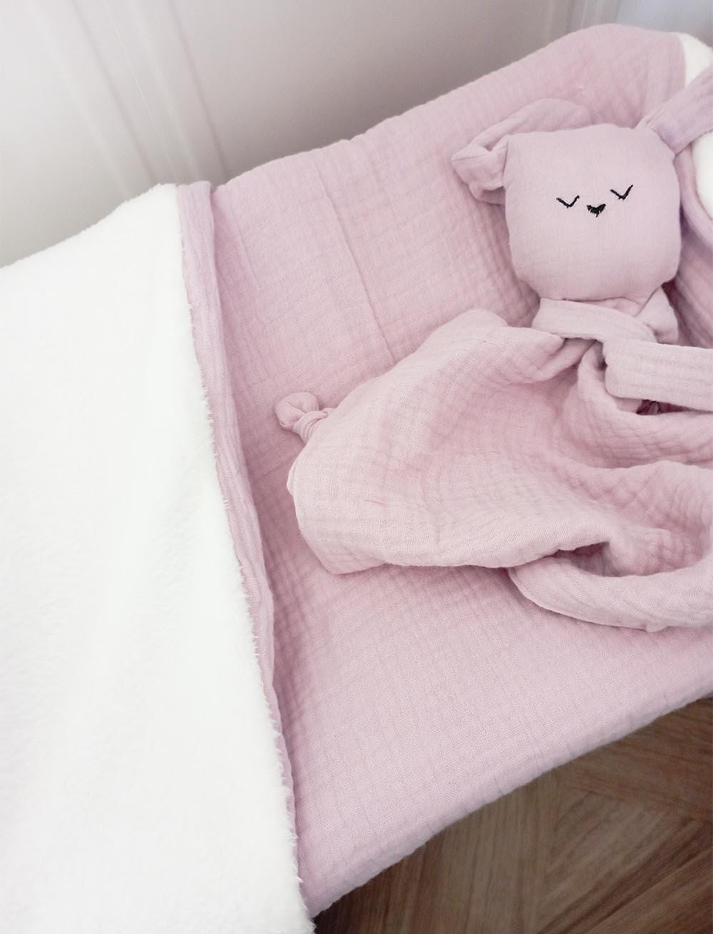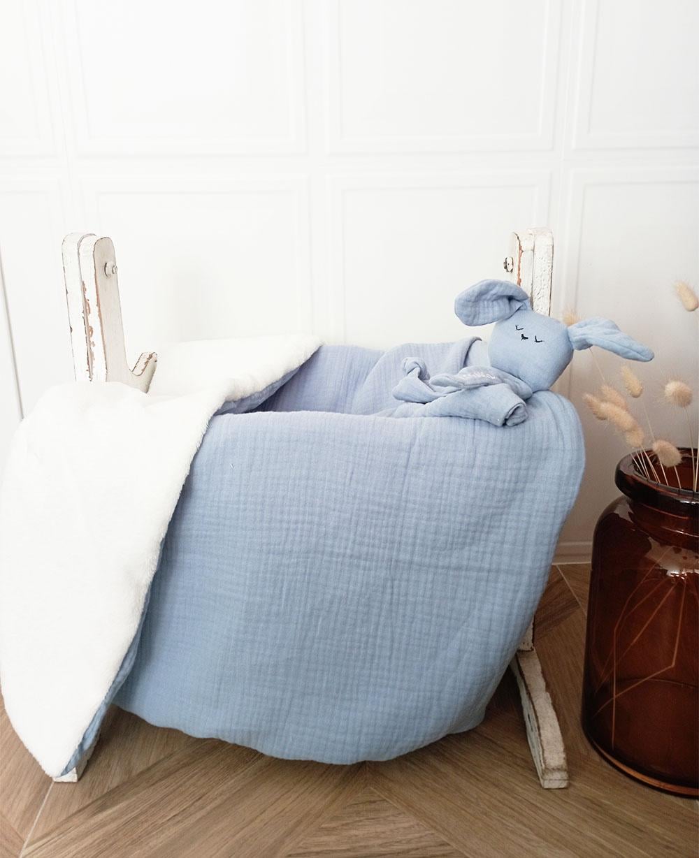 Muslin blanket for newborns that can be combined with the doudou and personalized with an embroidered name.