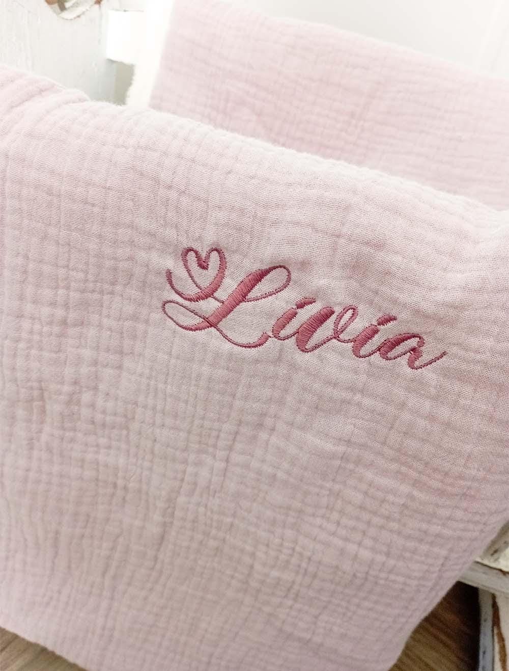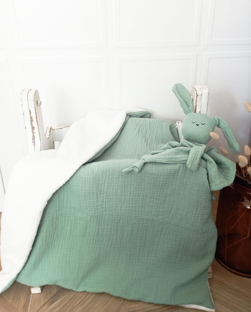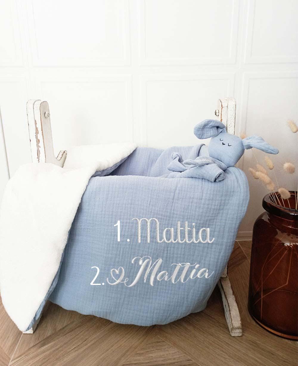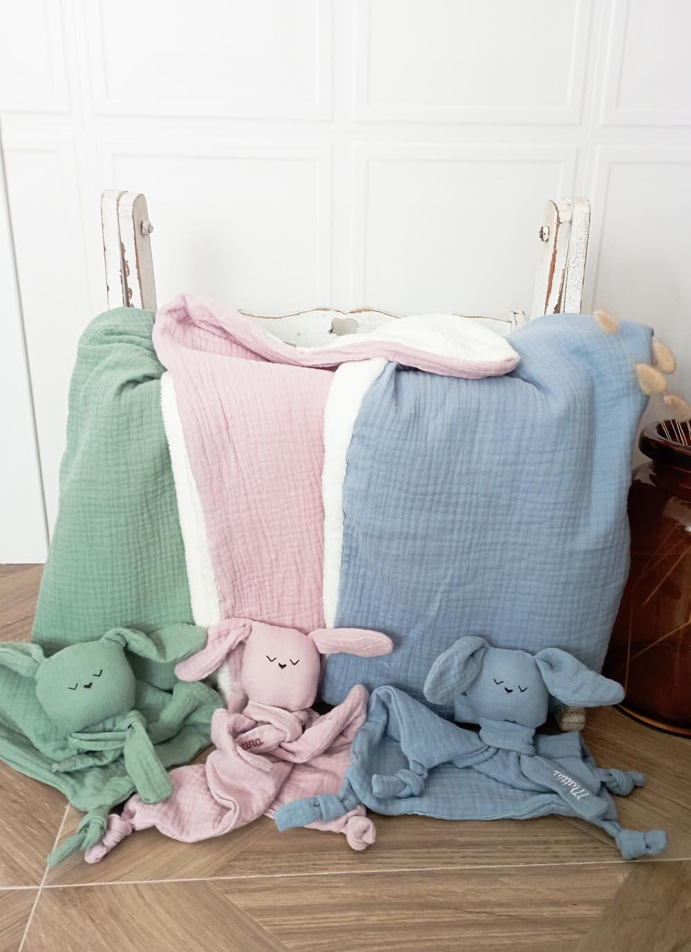 Muslin blanket for newborns that can be combined with the doudou and personalized with an embroidered name.
