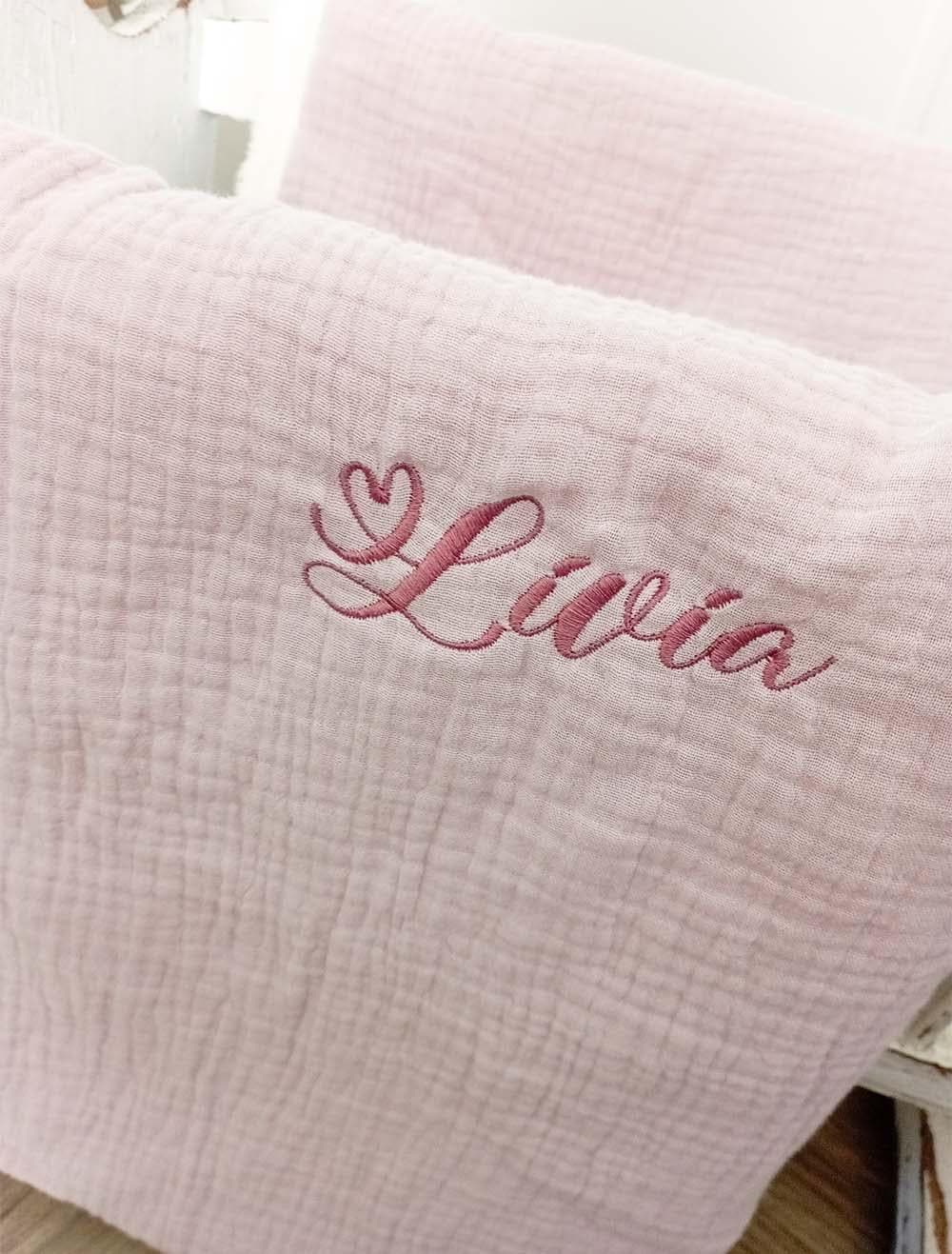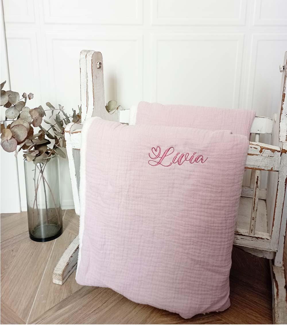 Soft triple-gauze cotton muslin blanket for newborns that can be combined with the doudou and personalized with an embroidered name.