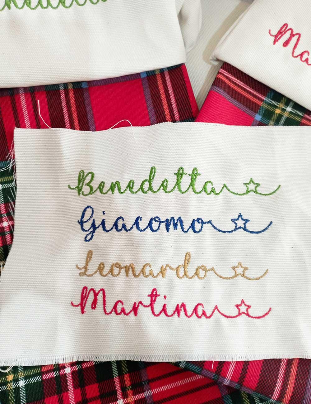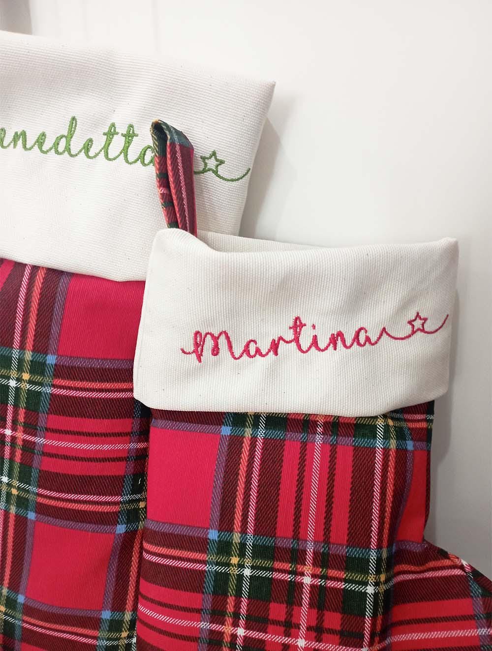 The stocking is fully finished, including the inner lining. The name color can be chosen in different colors. For simplicity, I've included the most common Christmas colors: