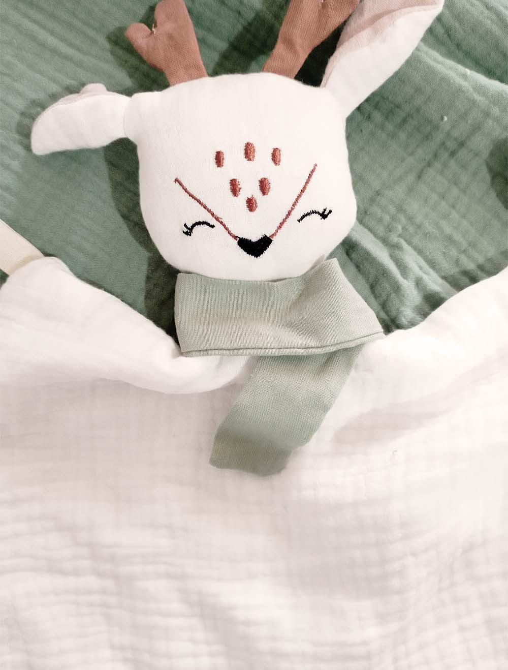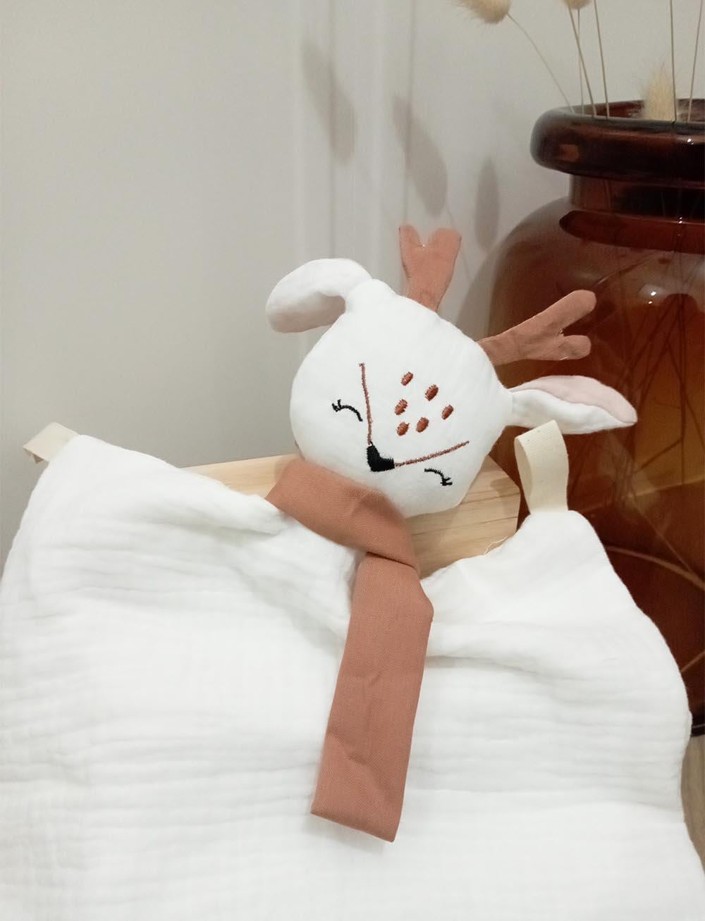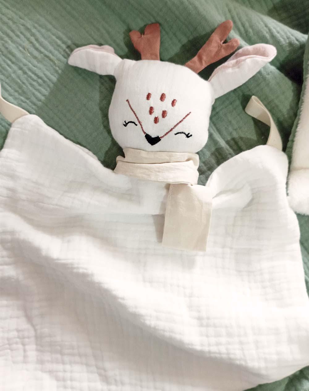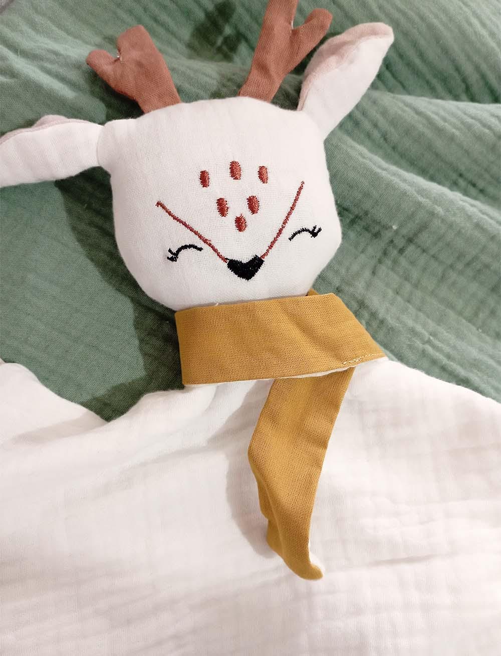 Sweet Dou-Dou deer, available with or without a scarf, made of triple-layer pure cotton gauze while the slipper is made of organic cotton.
