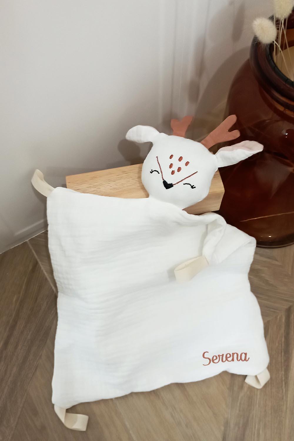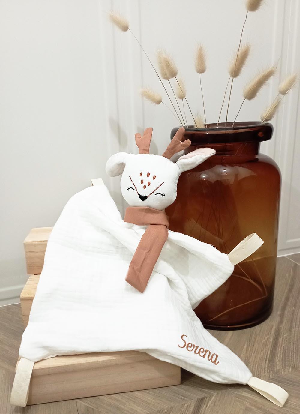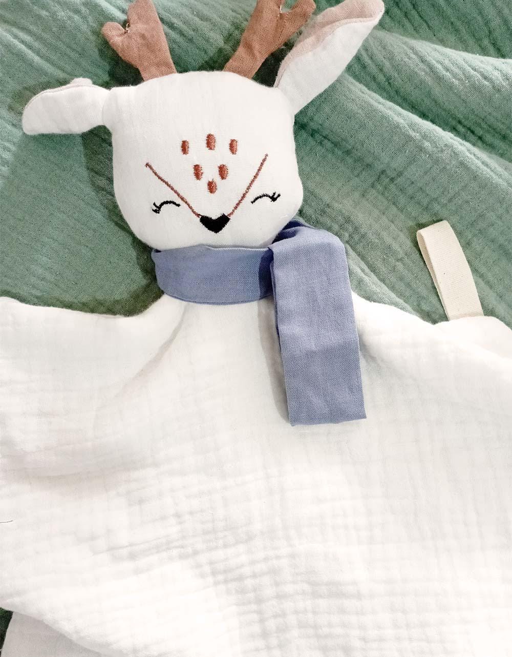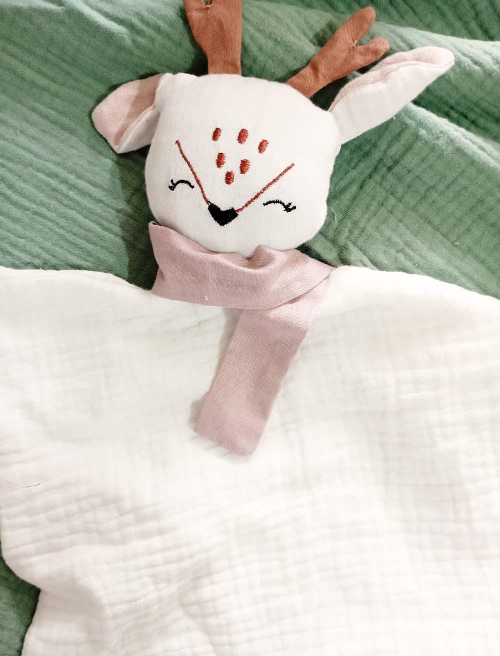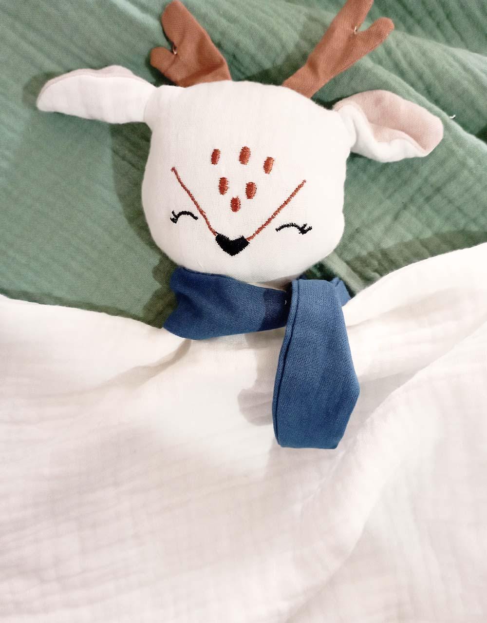 Sweet Dou-Dou deer, available with or without a scarf, made of triple-layer pure cotton gauze while the slipper is made of organic cotton.