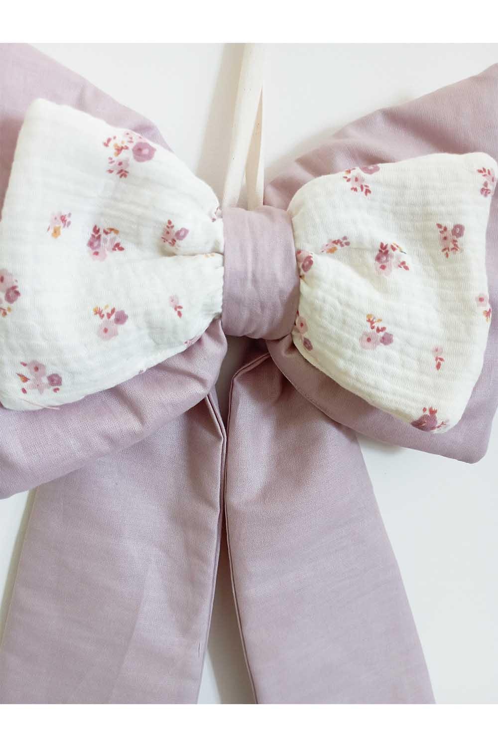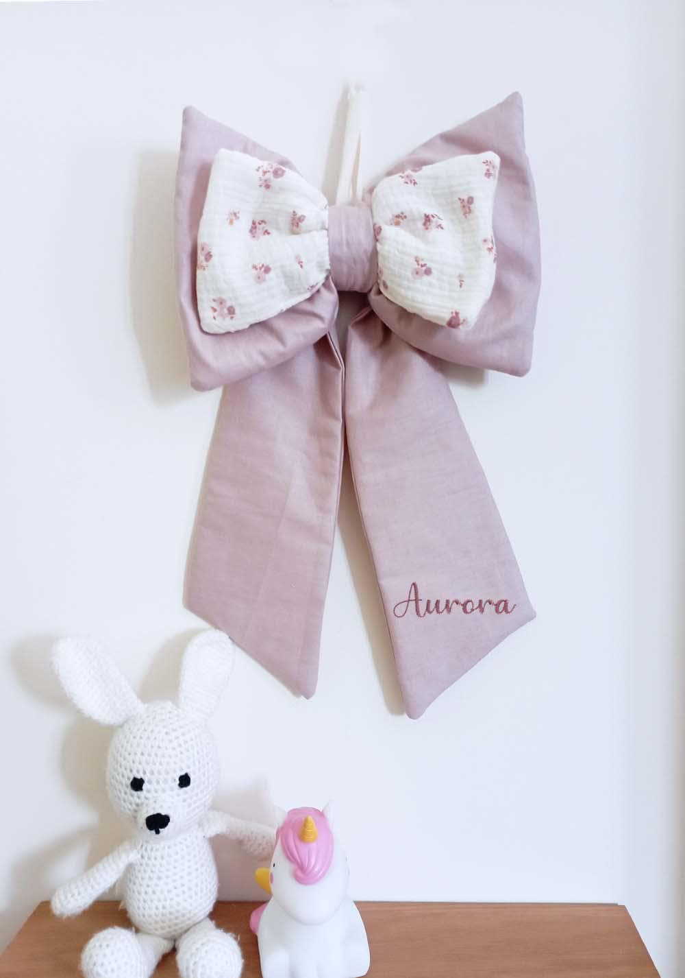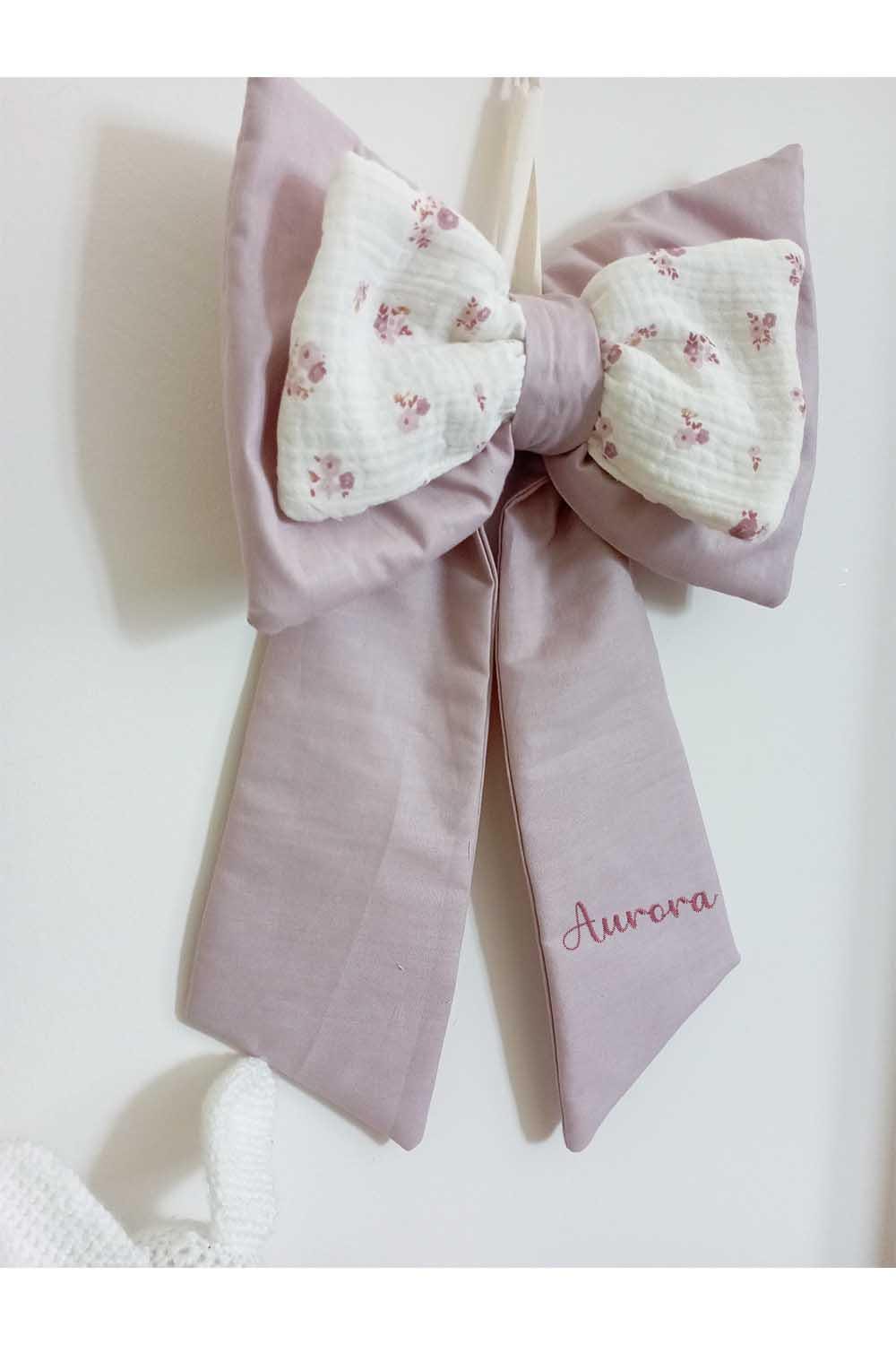 Handmade birth bow with pink flowers.