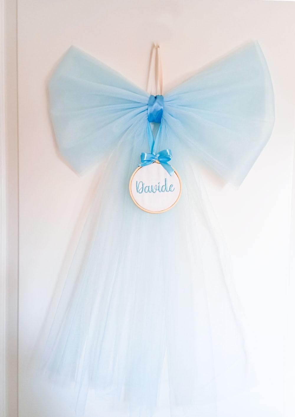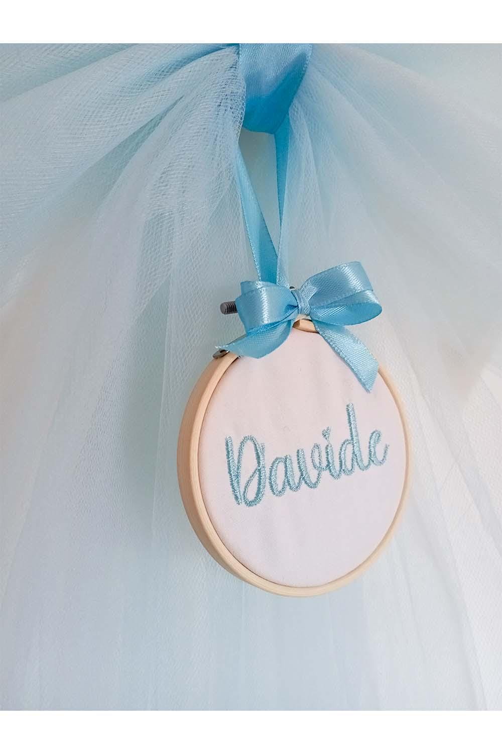 Handcrafted tulle birth bow with a small wooden frame embroidered with your name.